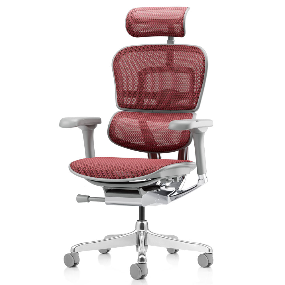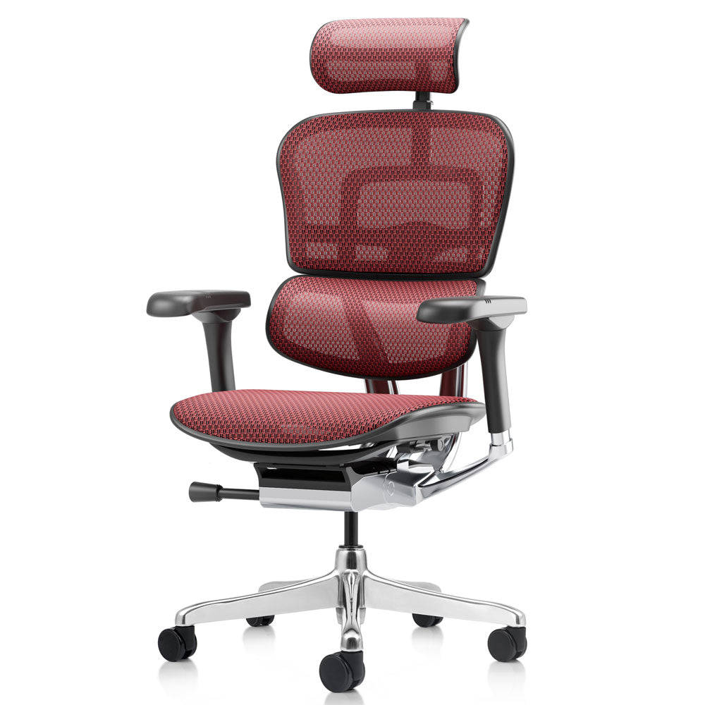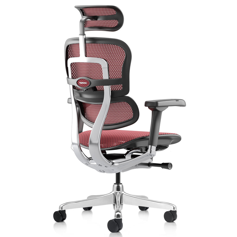 The Ergohuman Elite G2 in red mesh is a fully adjustable ergonomic office chair with a supportive headrest, breathable mesh, and a choice of black or grey polished frame. Designed for long‑lasting comfort and improved posture.