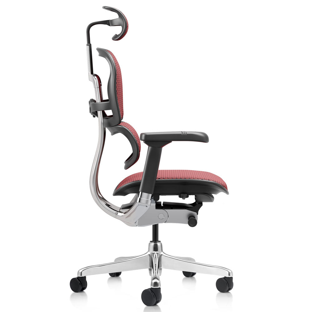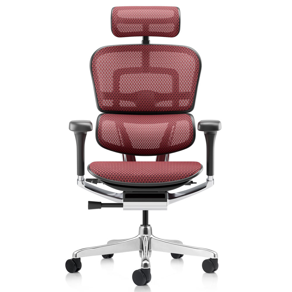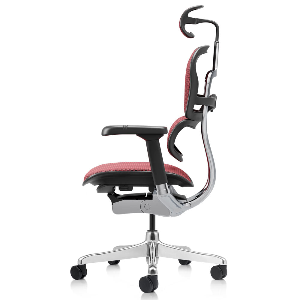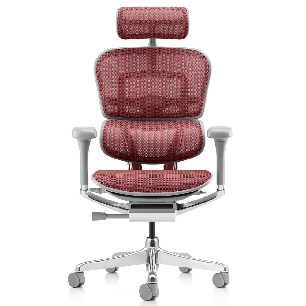 The Ergohuman Elite G2 in red mesh is a fully adjustable ergonomic office chair with a supportive headrest, breathable mesh, and a choice of black or grey polished frame. Designed for long‑lasting comfort and improved posture.