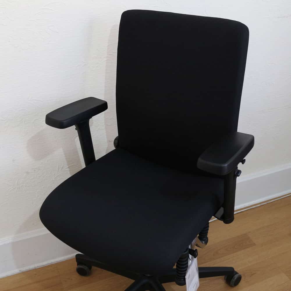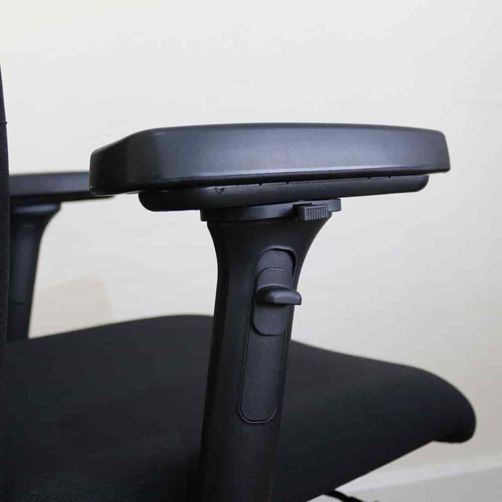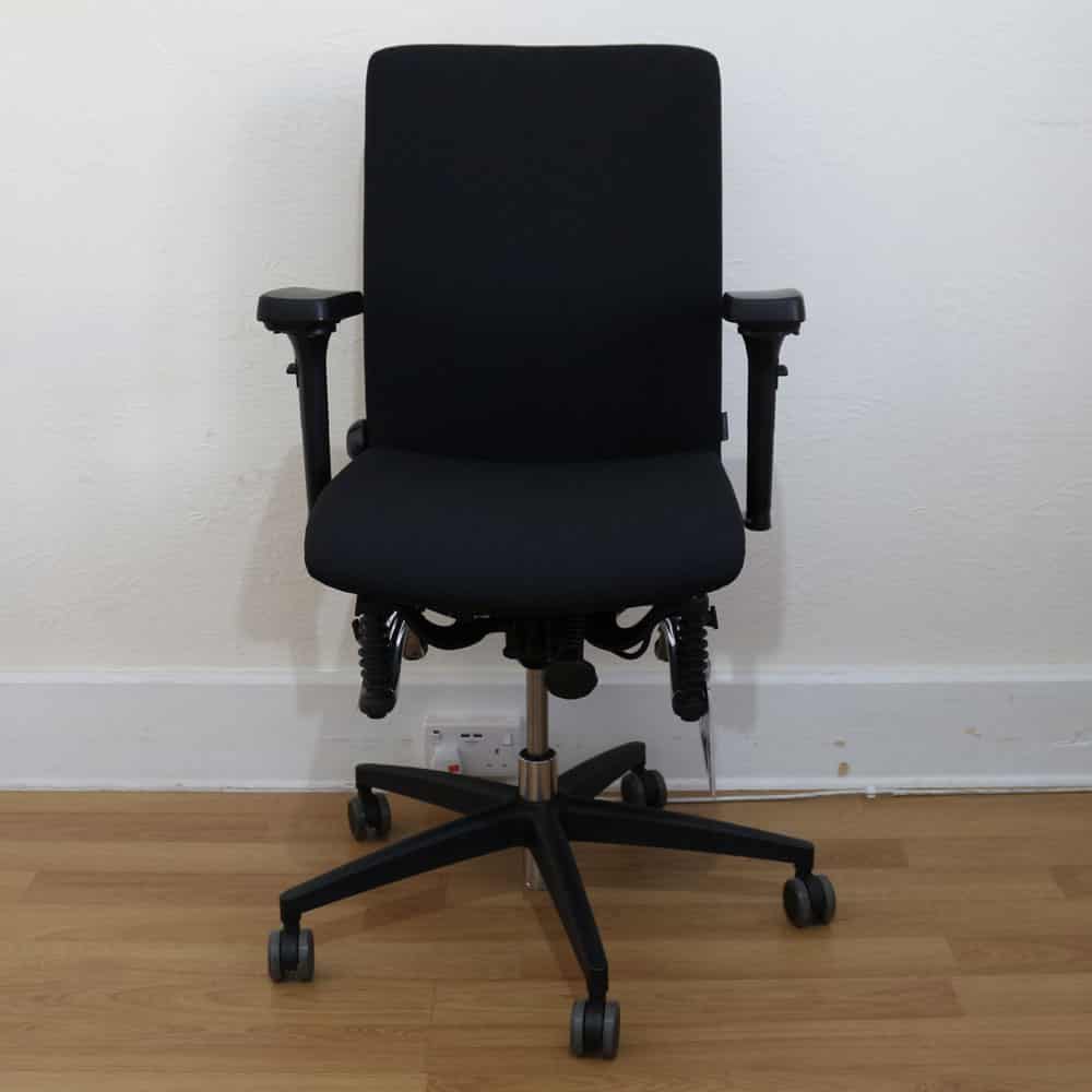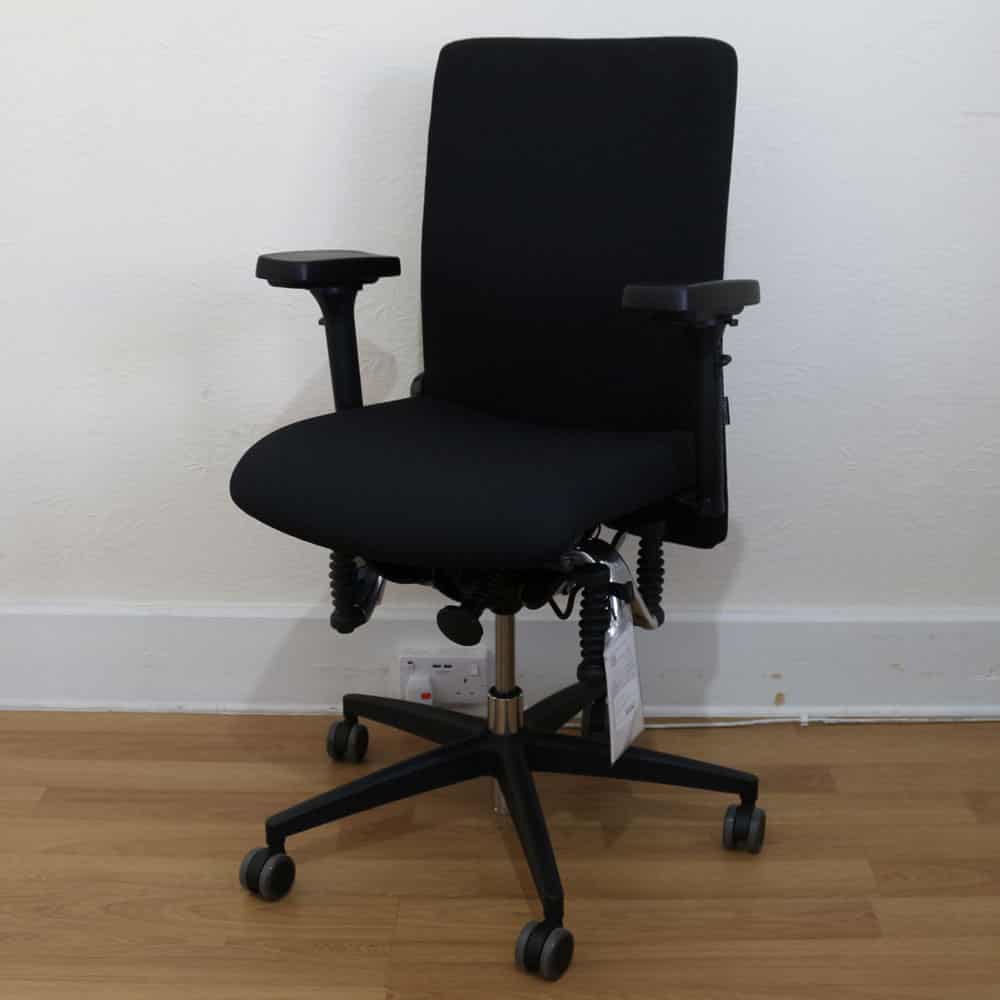 This showroom model features a black fabric seat and backrest, black armrests, and a black frame and base.